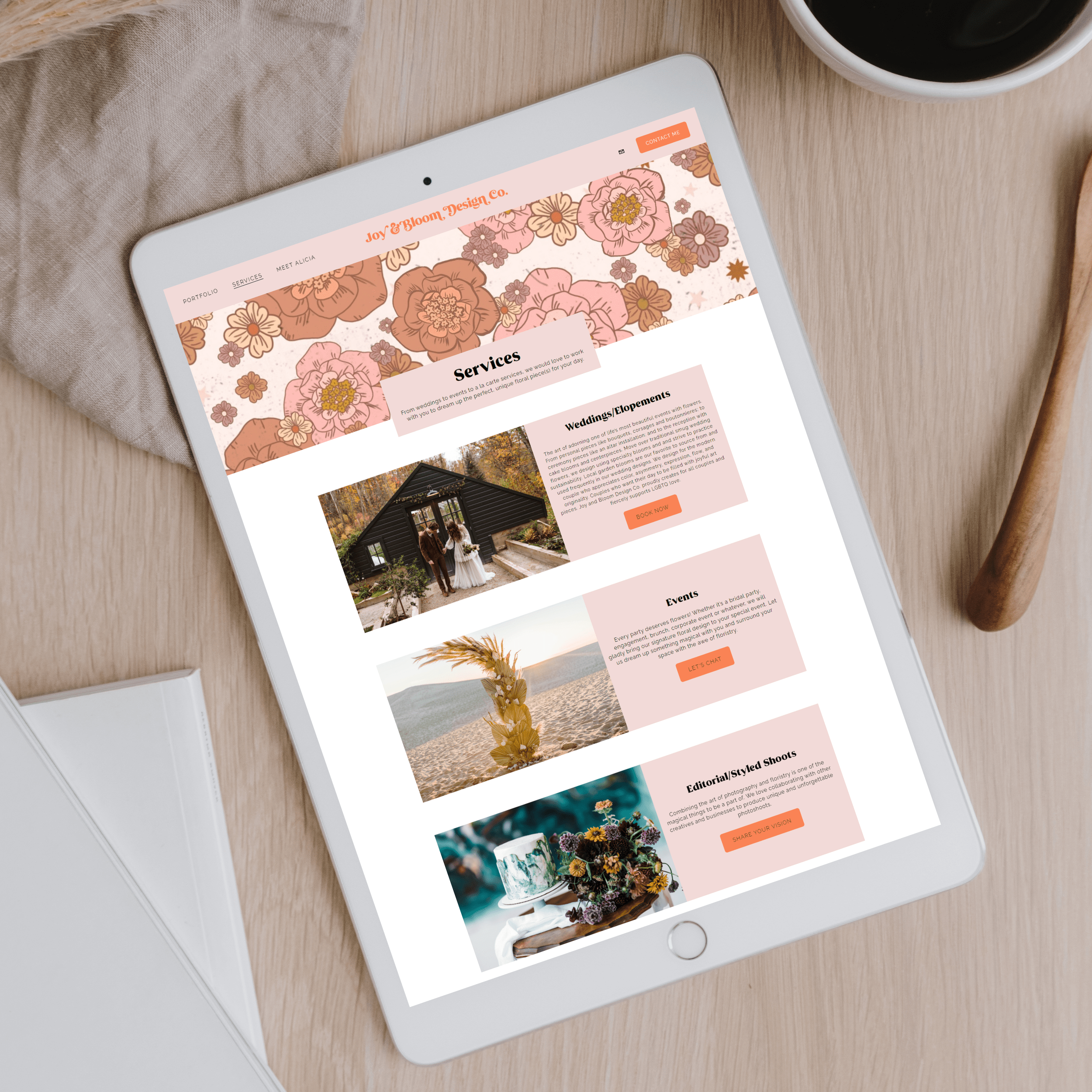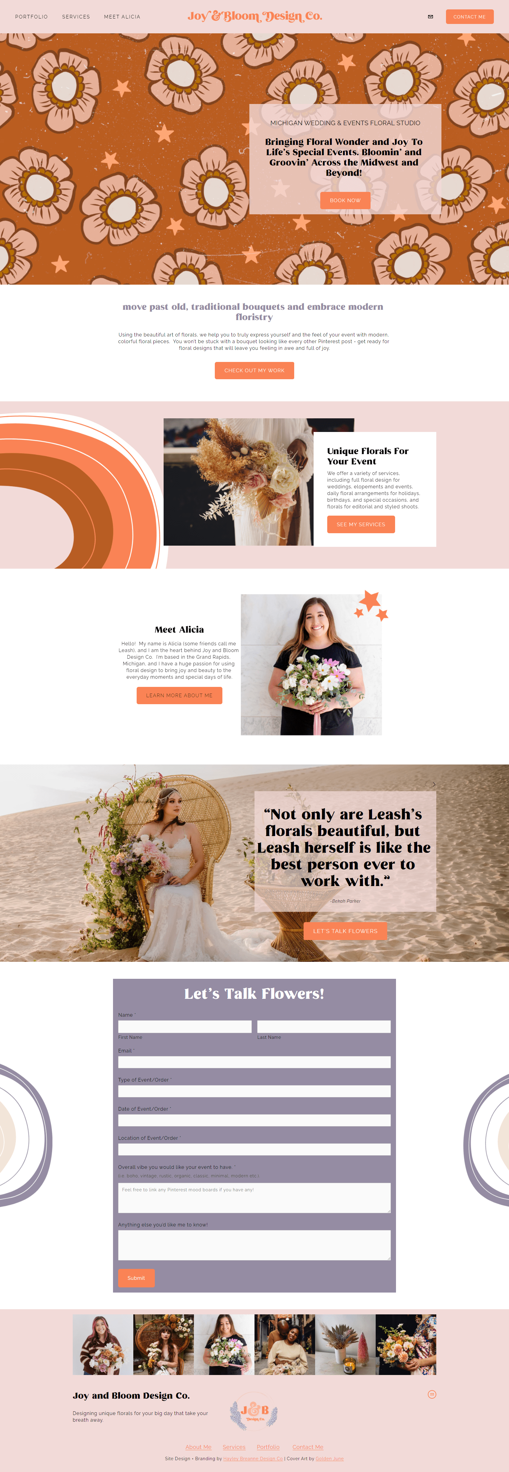 Alicia, owner of Joy and Bloom Design Co, is a floral designer providing unique and joy-filled floral arrangements for weddings, elopements, events, styled shoots, etc. We worked together to create an entire website for her customers to access all of her content and products, as well as creating a brand that reflected the joy and vibrant energy of her business.